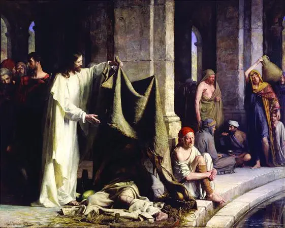 [2 ] Now there is in Jerusalem by the Sheep Gate a pool, in Aramaic called Bethesda, which has five roofed colonnades. [3 ] In these lay a multitude of invalids—blind, lame, and paralyzed. [5 ] One man was there who had been an invalid for thirty-eight years. [6 ] When Jesus saw him lying there and knew that he had already been there a long time, he said to him, “Do you want to be healed?” [7 ] The sick man answered him, “Sir, I have no one to put me into the pool when the water is stirred up, and while I am going another steps down before me.” [8 ] Jesus said to him, “Get up, take up your bed, and walk.” [9 ] And at once the man was healed, and he took up his bed and walked. Now that day was the Sabbath. (John 5:2-9 ESV)